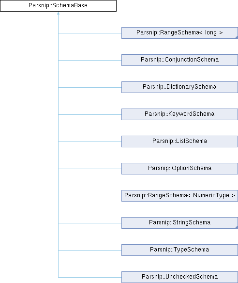 Implemented in Parsnip::UncheckedSchema, Parsnip::TypeSchema, Parsnip::StringSchema, Parsnip::RegExSchema, Parsnip::KeywordSchema, Parsnip::RangeSchema< NumericType >, Parsnip::RangeSchema< long >, Parsnip::IntegerSchema, Parsnip::OptionSchema, Parsnip::ListSchema, Parsnip::DictionarySchema, and Parsnip::ConjunctionSchema.